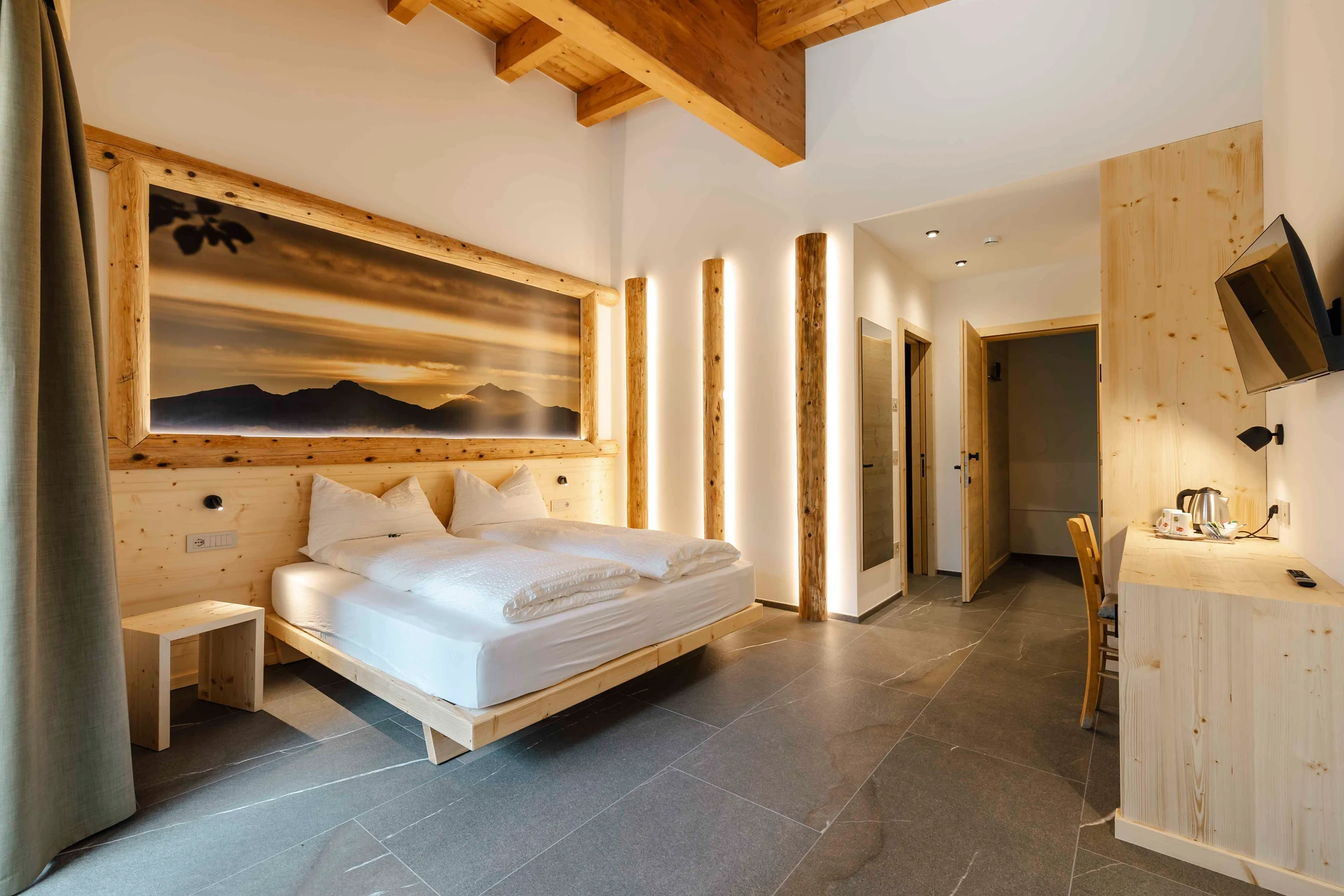 Mit viel Liebe zum Detail haben wir die Zimmer der Residence Lavina gestaltet, um Ihnen einen Ort voller Geborgenheit und natürlichem Charme zu bieten. Im Innenbereich dominiert hochwertiges Holz, das eine warme und einladende Atmosphäre schafft. Dieses Material, inspiriert von der umliegenden Natur, bringt den Wald direkt in Ihre Unterkunft.
